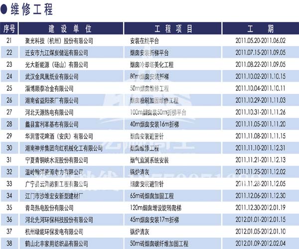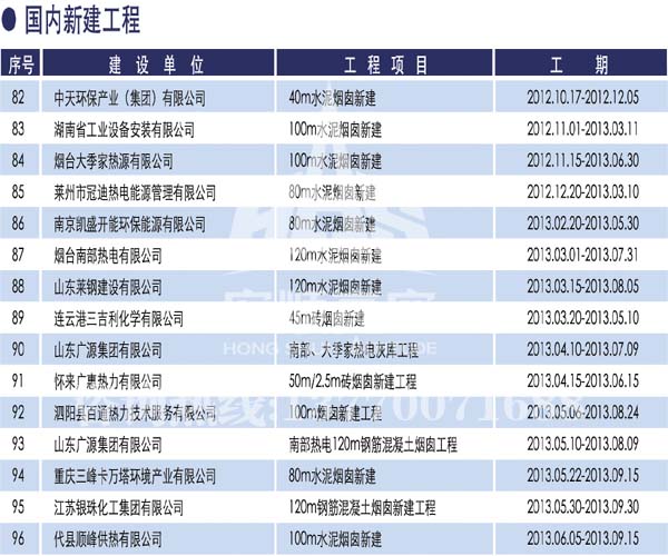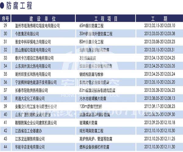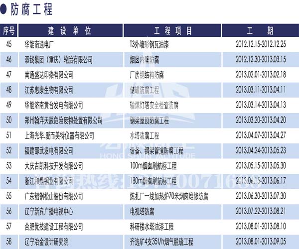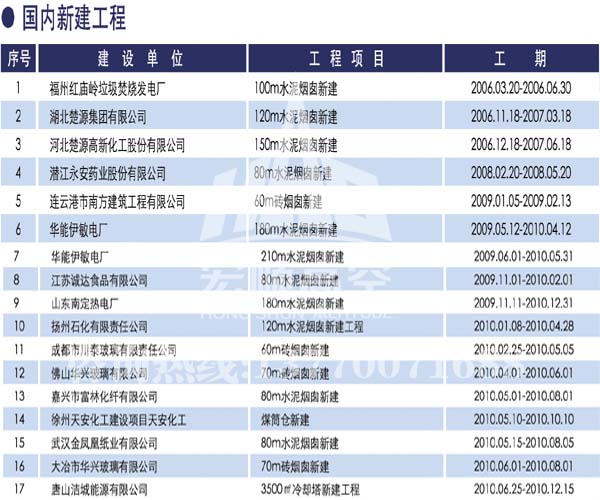 宏順建設(shè)工程有限公司是國(guó)家批準(zhǔn)成立的專業(yè)高空作業(yè)企業(yè):承攬過(guò)(國(guó)內(nèi).國(guó)外)煙囪新建、煙囪防腐、吊機(jī)防腐、水塔防腐、管道防腐、龍門(mén)吊防腐、儲(chǔ)存罐防腐、煙囪內(nèi)壁防腐等高空作業(yè)工程。具有“不搭腳手架 、 不需要停產(chǎn)”施工特點(diǎn)。